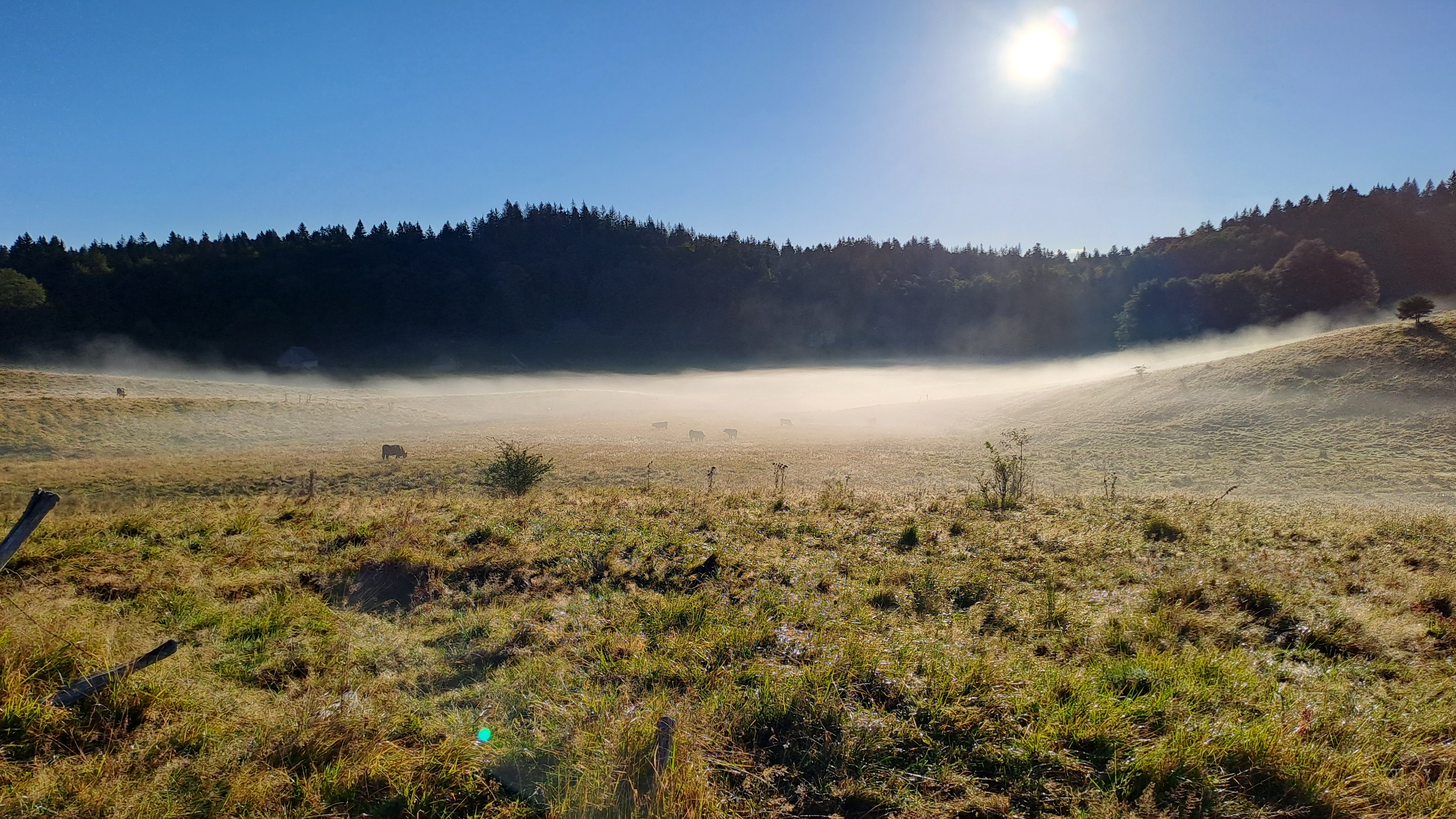 Je reprends le GR96, GRP du Massif des Bauges en direction du col de la Cochette. Je suis maintenant dans des prairies, seul, et j'admire un site étonnant : par un soleil splendide, un peu de brume est restée scotchée dans un creux, et les vaches ne s'y sont pas trompées, elles paissent au frais !